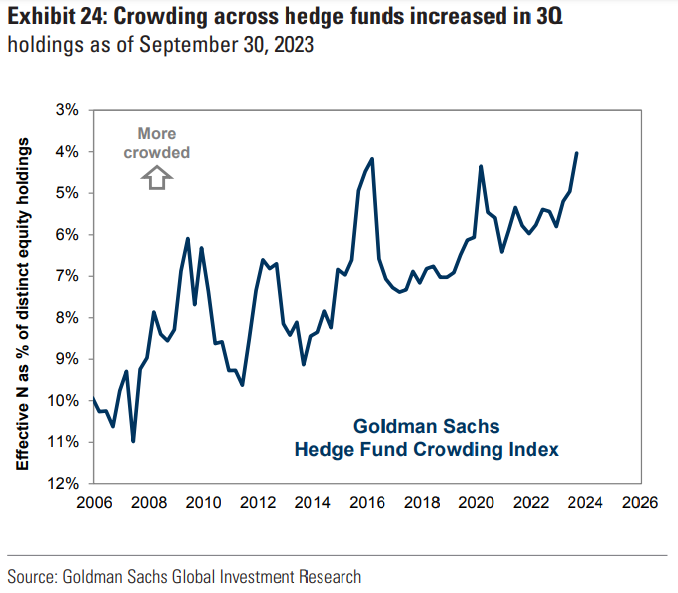 该投资银行创建的用于跟踪对冲基金集中投资的指数已经达到历史最高水平,根据周一发布的一份报告,报告称平均基金持有其前10个头寸中的70%。