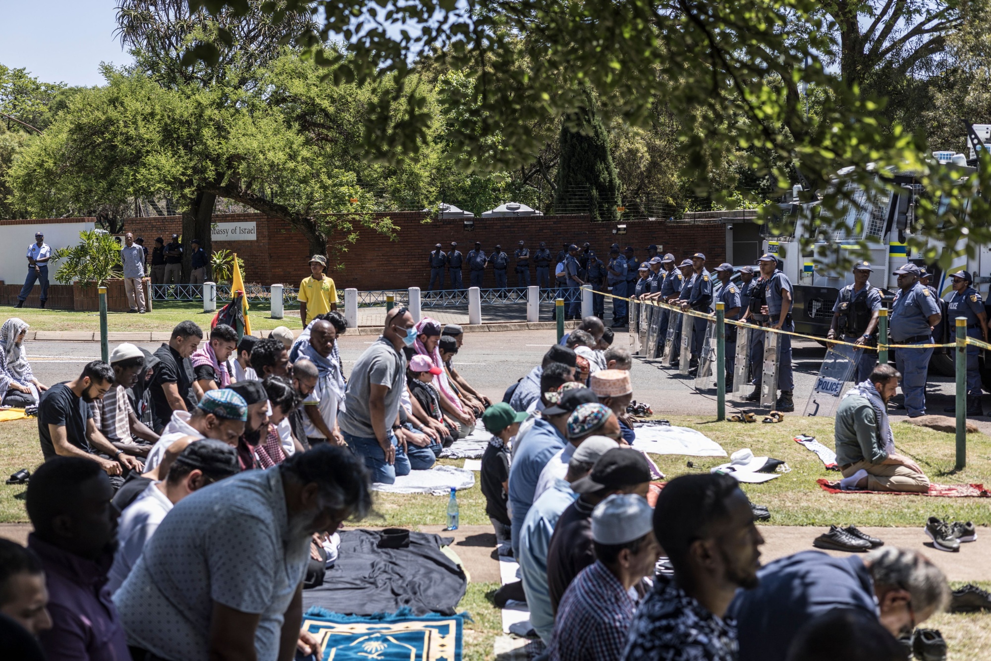 穆斯林在比勒陀利亚以色列大使馆外进行星期五祈祷,支持加沙。