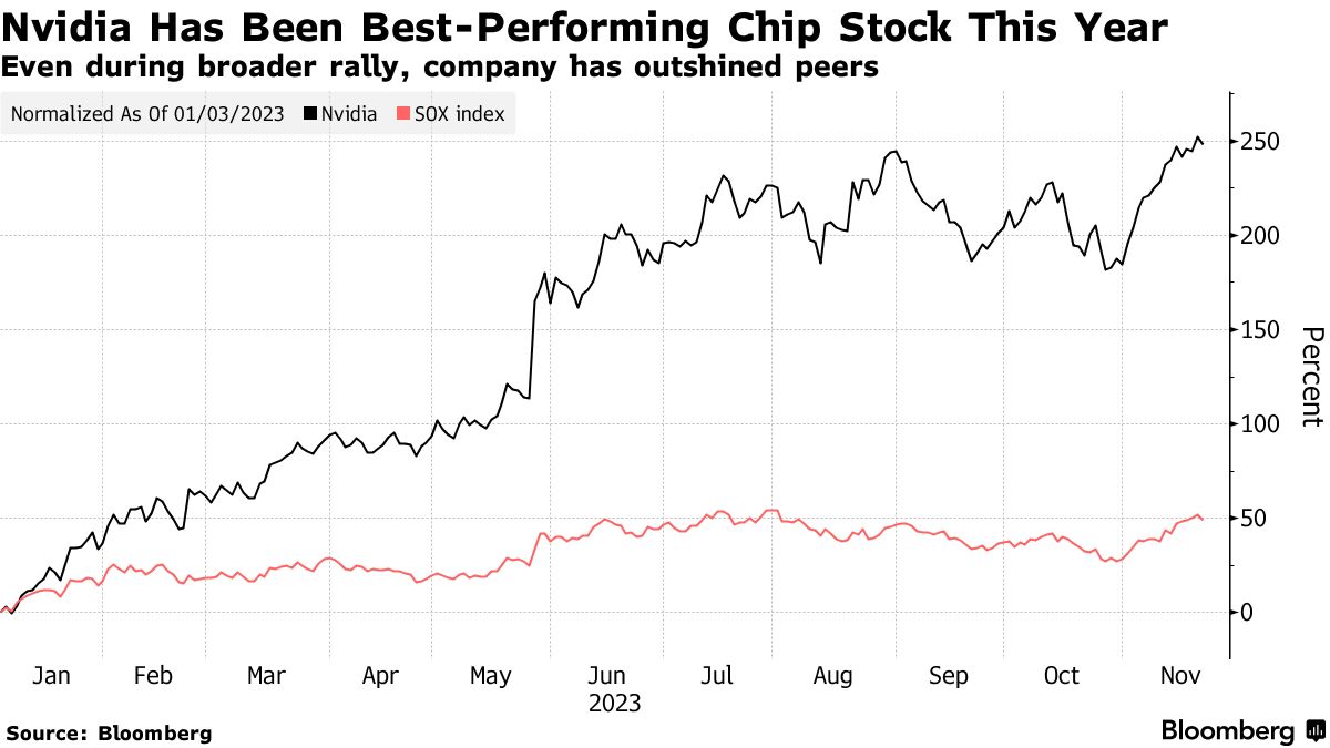 Nvidia股票周二在纽约收盘价为499.44美元。该公司今年在费城证券交易所半导体指数中表现最佳,使其估值超过1.2万亿美元。