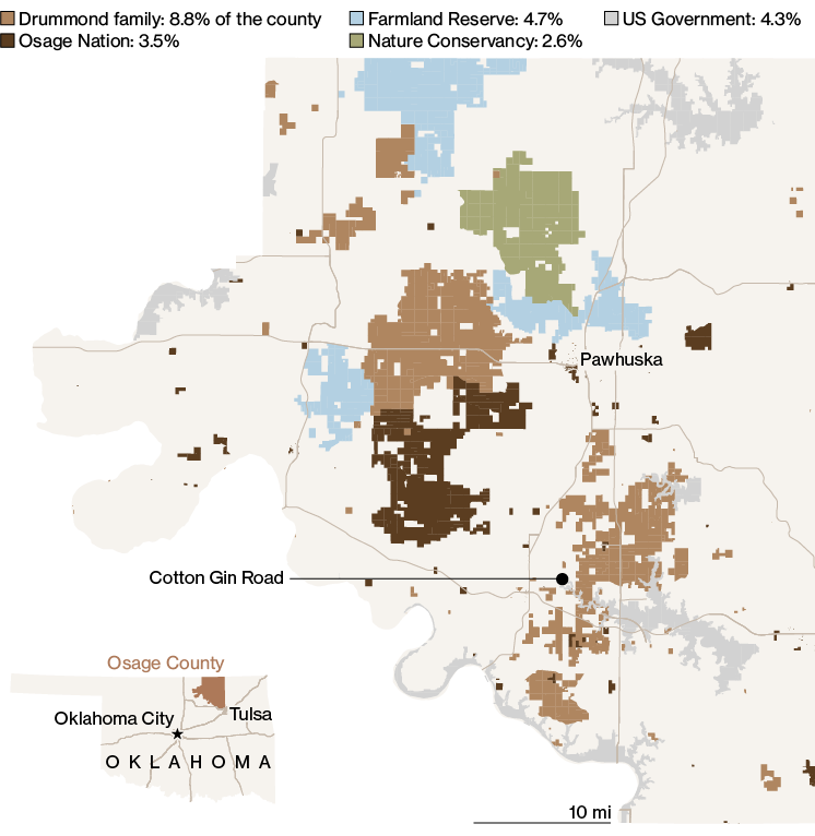 今天奥萨奇县土地所有权地图。奥萨奇族仅拥有其原来领土的3.5%。德拉蒙德家族拥有其2.5倍的土地。地图:Jeremy CF Lin/Bloomberg News彭博社的调查记者Rachel Adams-Heard得到线报,奥萨奇县最大的土地所有者德拉蒙德家族据传拥有奥萨奇石油权益。一些读者可能因为里·德拉蒙德(Ree Drummond)而熟悉这个名字,她嫁入这个家族,并且是热门Food Network节目《荒野女王》的明星。但事实证明,德拉蒙德家族如何建立他们的俄克拉荷马帝国的故事与奥萨奇族息息相关,今天仍然如此。本周发布的In Trust的特别剧集探讨了奥萨奇族如何重新夺回土地和主权,而《花月杀手》则突显了他们历史上的悲剧。您可以在这里了解更多关于这个播客的信息。