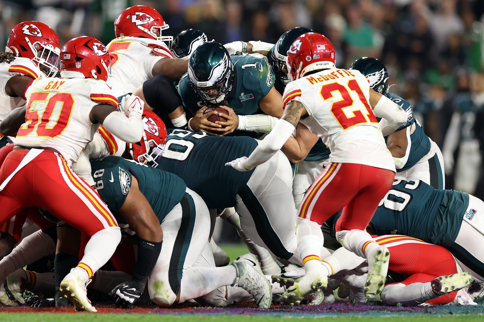 费城老鹰队的贾伦·赫兹(Jalen Hurts)#1在超级碗LVII对阵堪萨斯城酋长队的比赛中携球前进。