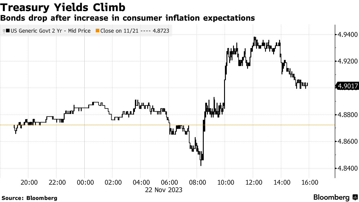 在感恩节假期前的低交易日中,两年期美国国债收益率接近4.9%。标普500指数小幅上涨。亚马逊公司在黑色星期五和网络星期一销售前上涨。 微软公司因山姆·奥尔特曼将重返OpenAI领导而上涨。 英伟达公司因业绩下滑而下跌。 美元上涨。石油下跌。
