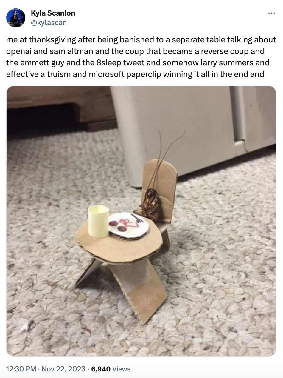 当你可能还在睡觉的时候,Sam Altman 达成了与OpenAI的协议,重新加入担任CEO。 Dave Lee 说“这个故事只是刚刚开始的结束”,但至少他们达成了某种解决方案在假期之前!现在你可以惹恼你的家人(或者至少是小桌子上的孩子们)关于微软“获得所有的光芒而没有责任,还有更多的控制”的亲密TED演讲, 根据Parmy Olson。