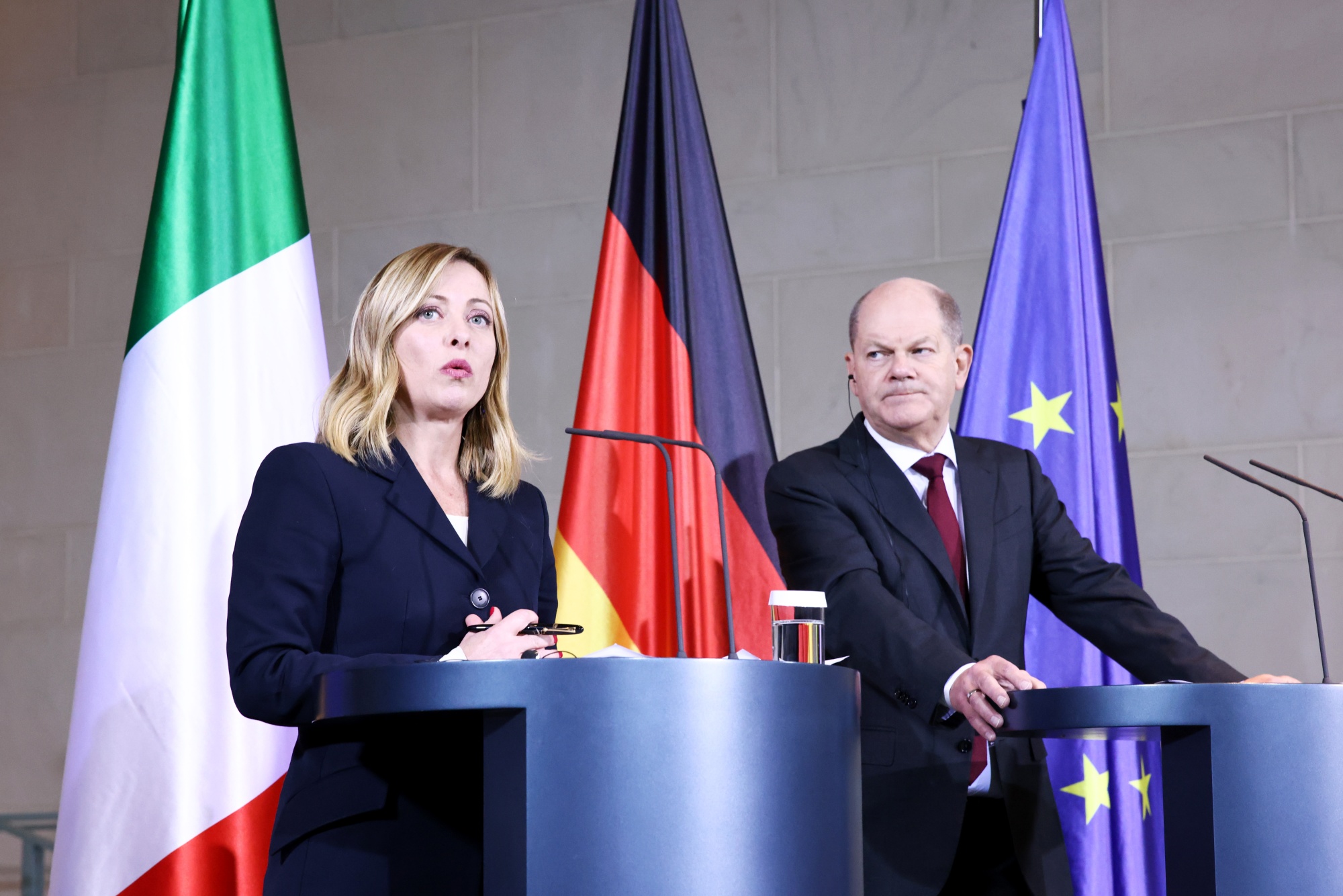 乔尔贾·梅洛尼(Giorgia Meloni)左,和奥拉夫·肖尔茨(Olaf Scholz)在德国柏林总理府举行联合新闻发布会,时间为11月22日。