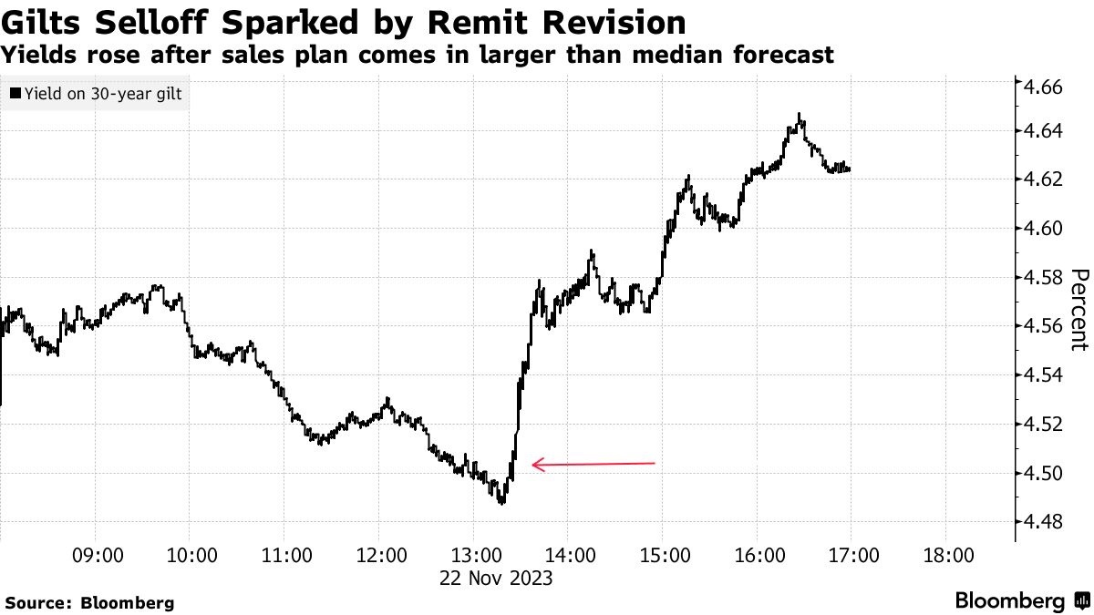 债券下跌,因为英国将其债券发行计划在本财政年度保持基本不变,这让市场感到意外,因为市场预计会有更大的削减。债务管理办公室周三表示,它将在2023年至2024年财政年度发行2373亿英镑(2960亿美元)的政府债券,基本符合4月份宣布的2378亿英镑的计划。这与上周彭博调查中银行估计的2240亿英镑相比。调查。