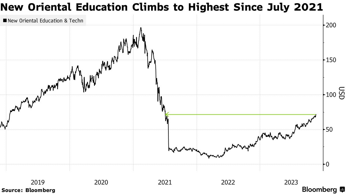 这家在美国上市的股票目前正以自2021年7月以来的最高水平交易,那是中国在那个月震惊商界的时候禁止了大部分私营教育行业。尽管仍远低于历史最高水平,新东方已经通过利用一些竞争对手的退出以及提供新服务而实现了复苏。
