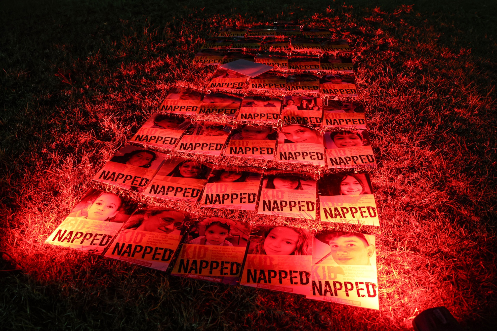 以色列儿童被绑架者的肖像在11月20日的特拉维夫集会上。