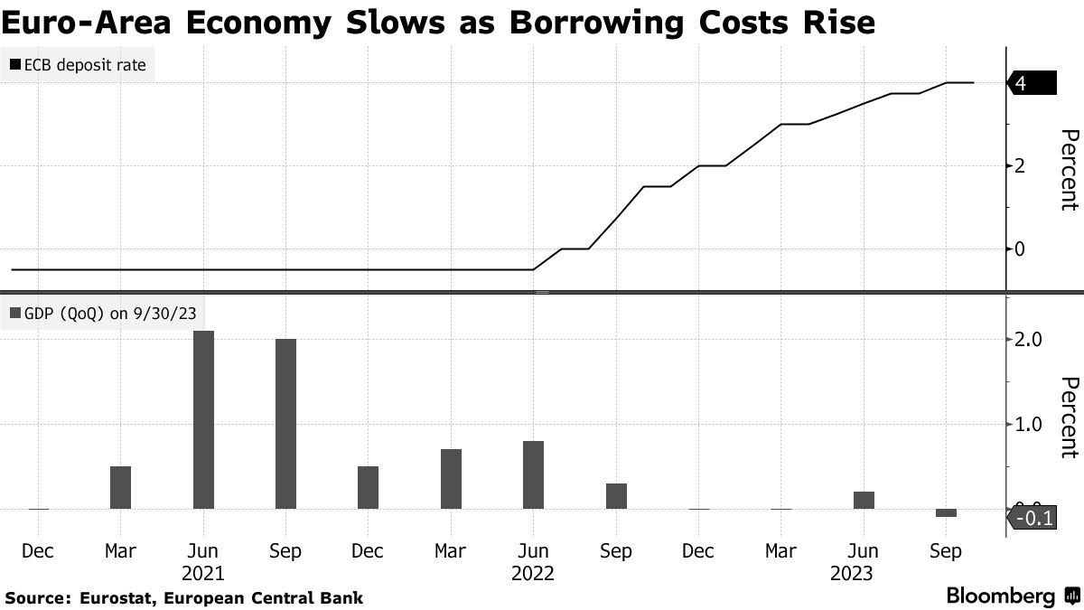欧洲央行自2022年中期以来已经加息10次,但上个月将利率保持不变。尽管这一行动的影响日益在房地产等行业感受到,但大部分紧缩措施尚未传导,因为家庭、企业和政府的借款成本只逐渐上升。