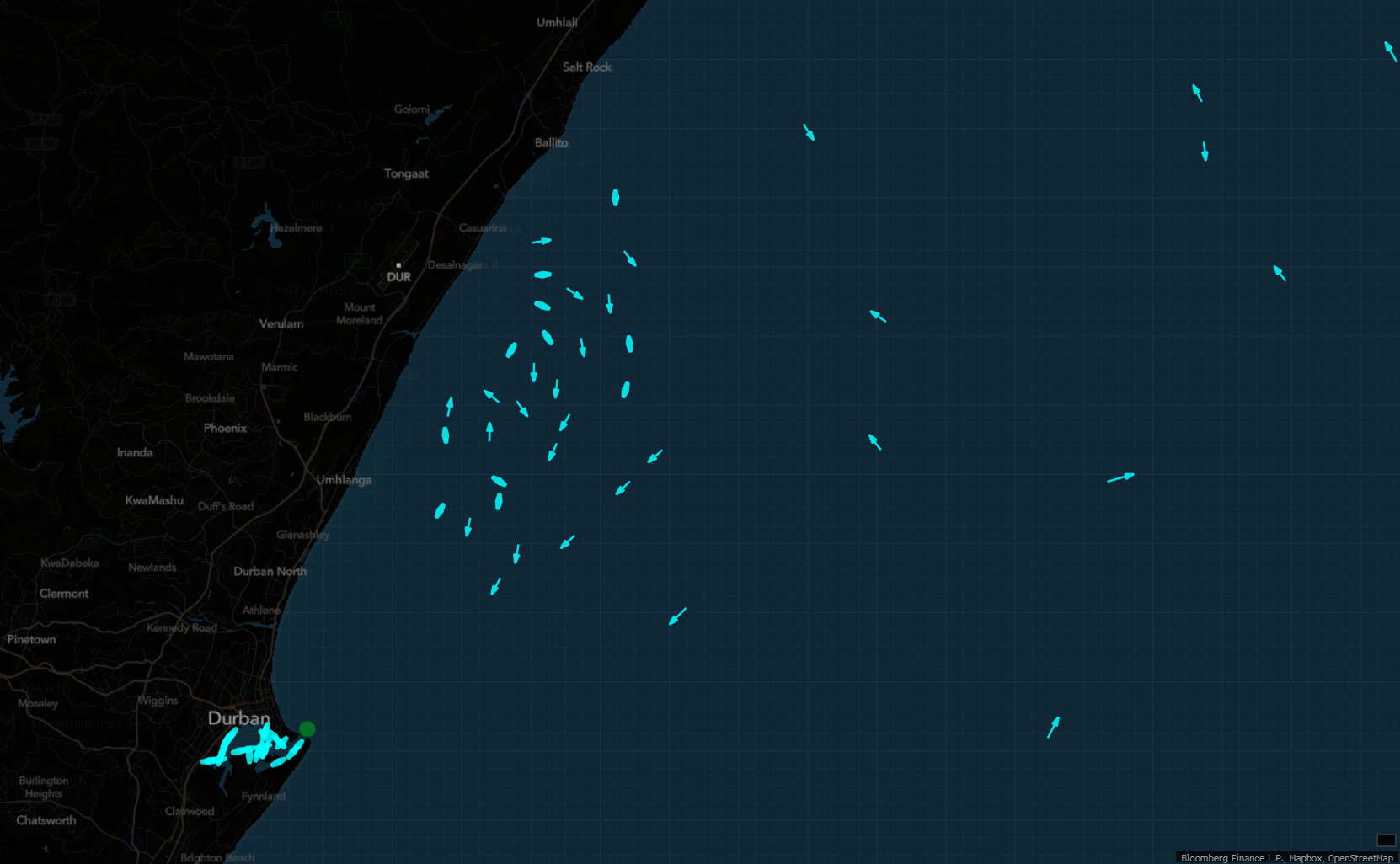 根据彭博编制的船舶跟踪数据,周三在德班附近或周边有近70艘集装箱、货船和散货船。部分拥堵促使A.P. Moller-Maersk A/S取消了开曼岛作为其亚洲航线之一的停靠点。