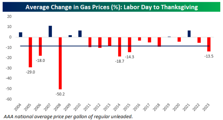 燃油价格在这个时候发生变化并不罕见,但2023年从劳动节到感恩节的下降幅度远远超过了平均水平,正如Bespoke投资集团在这张图表中展示的那样: