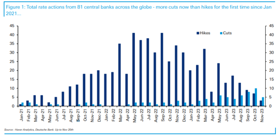 在各国为了应对不同程度的通货膨胀而采取不同货币政策之后,央行再次开始步调一致。这一次,走势是向下的。利率正在下降。德意志银行的下面的图表涵盖了全球81家央行,显示现在降息的央行比升息的央行更多,这是自2021年以来首次出现这种情况。