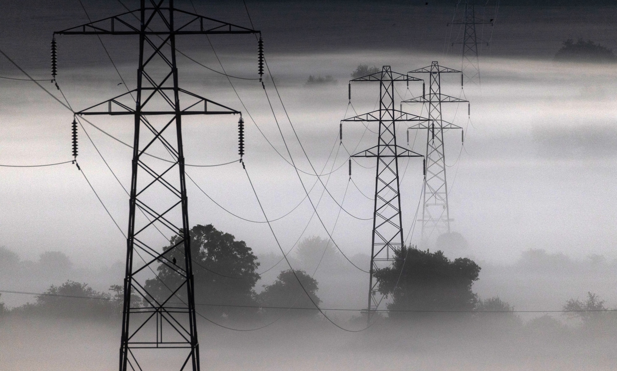电力塔在晨雾中被覆盖。