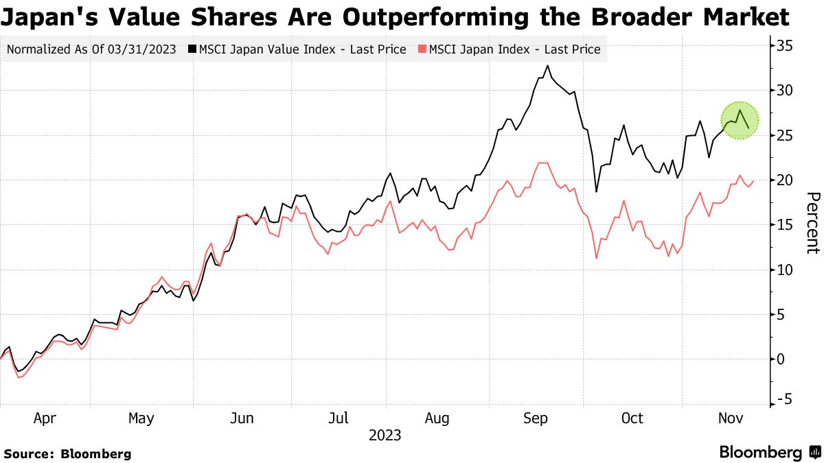 所谓的价值股指标,即相对基本面而言相对便宜的一类股票,今年已经上涨了30%,随着亚洲第二大经济体在经历了三十年的低迷后走出困境。然而,与更广泛的指标相比,MSCI日本价值指数的表现在本季度受到了阻碍,因为投资者在对经济前景表示担忧时锁定了收益。