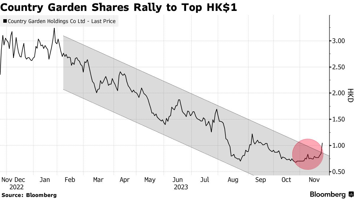 股价本月上涨了50%,周四收盘价略高于1港元。持续的涨幅将有助于碧桂园摆脱其低价股地位,尽管股价仍远低于2018年的高峰期超过17港元。11月份的涨幅跟踪了开发商股票的广泛上涨迹象,表明该行业的支持正在扩大。