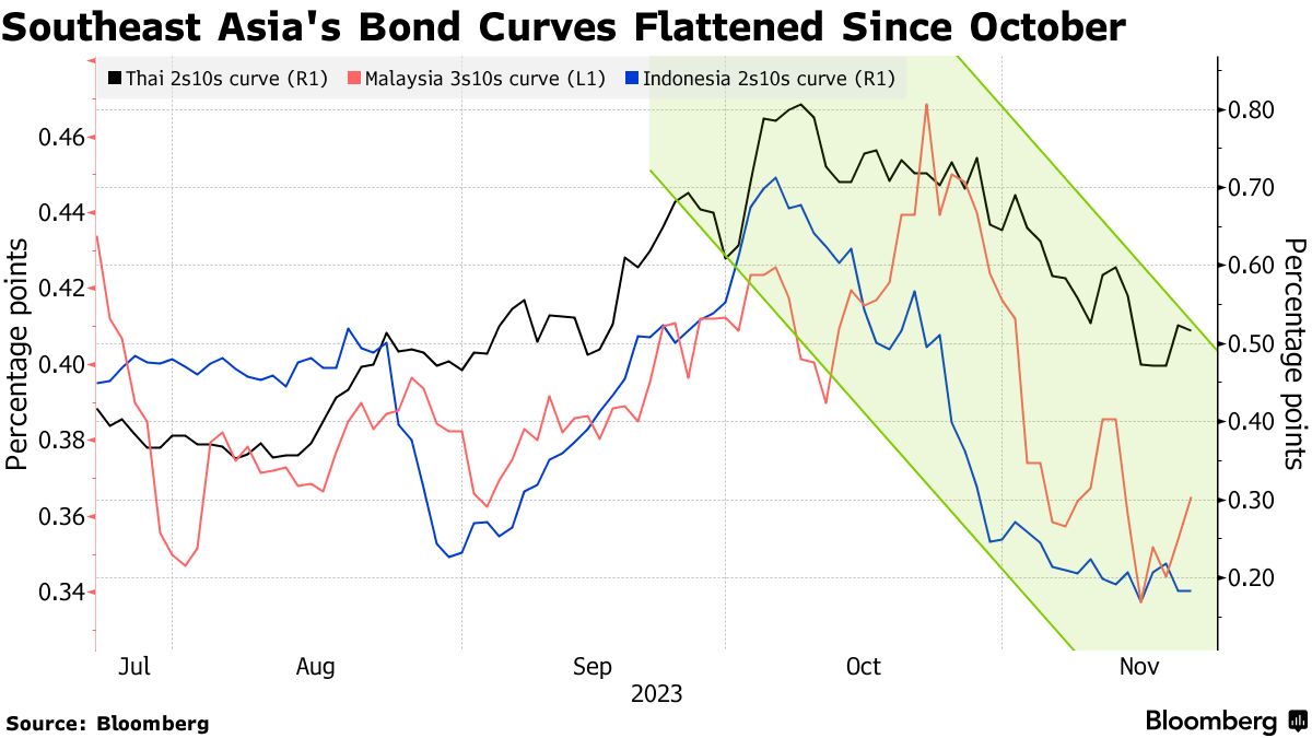 预计在通胀压力减轻的情况下,这种平坦化的走势将在本季度延续,因为长期收益率继续下降。泰国上个月发布了近两年来的首次通缩数据,而印尼的通胀已经回落到央行的2%-4%目标范围内。马来西亚的消费价格在9月份以来升幅最小,自2021年3月以来。马来西亚将于周五发布其10月份的通胀数据,预计与上个月基本持平。