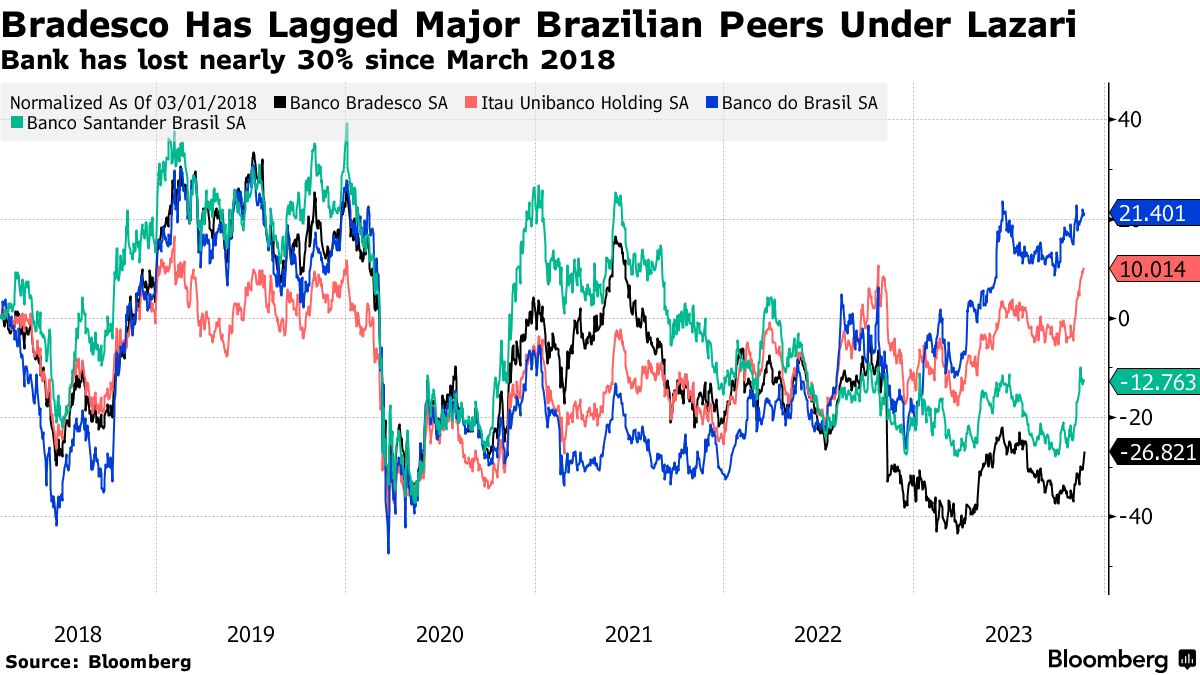 自2018年上任以来,Lazari在巴西的信贷周期困难中领导了Bradesco。该银行的盈利一直未能达到分析师的预期,去年第四季度的数据被一些人认为是史上最糟糕的。它严重受到与零售商Americanas SA破产有关的贷款损失准备金的影响,同时也因相对于同行的更高敞口于小公司和低收入客户而陷入困境。