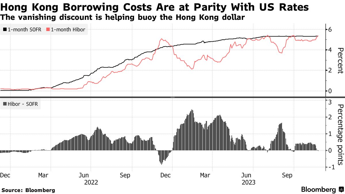 推动这一上涨的是押注资金成本将继续高于美元利率,因为当地银行为年底的监管检查而囤积现金。这使得所谓的卖出香港元买入美国资产的套利交易变得不赚钱,迫使做空者止损并加速了上涨。