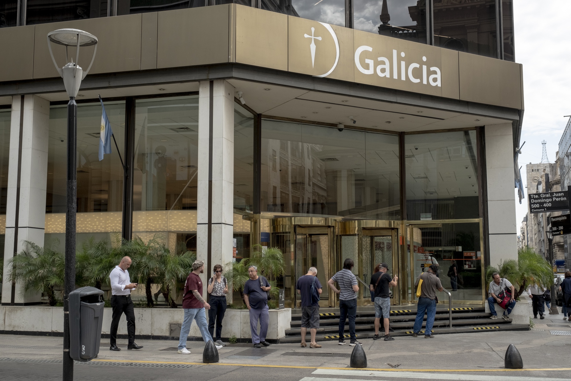 顾客们在11月21日在布宜诺斯艾利斯金融区的Banco Galicia银行分行外排队等候。