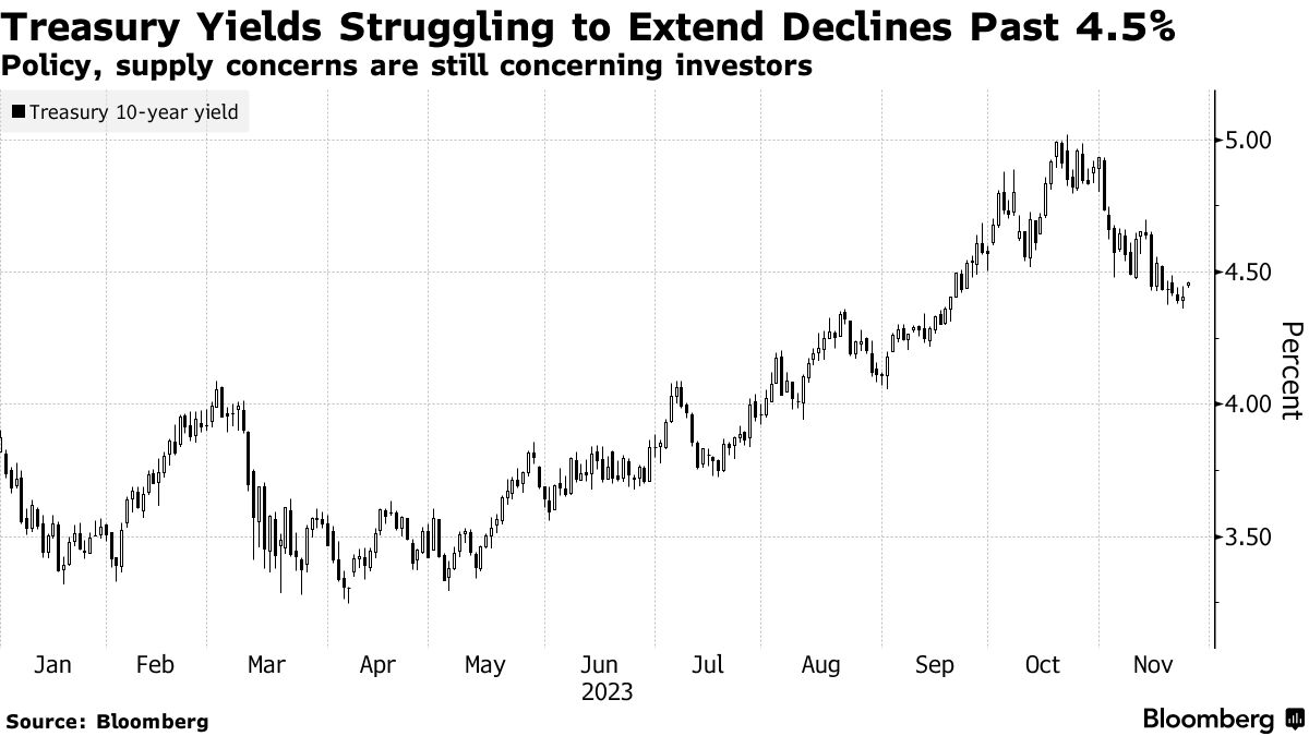 美国国债跟随欧洲债券下跌,这是由于对不断增长的供应的担忧。在上周德国最高法院的裁决迫使奥拉夫·肖尔茨政府进行了一次激进的预算改革之后,德国将连续第四年暂停净新借款的宪法限制。