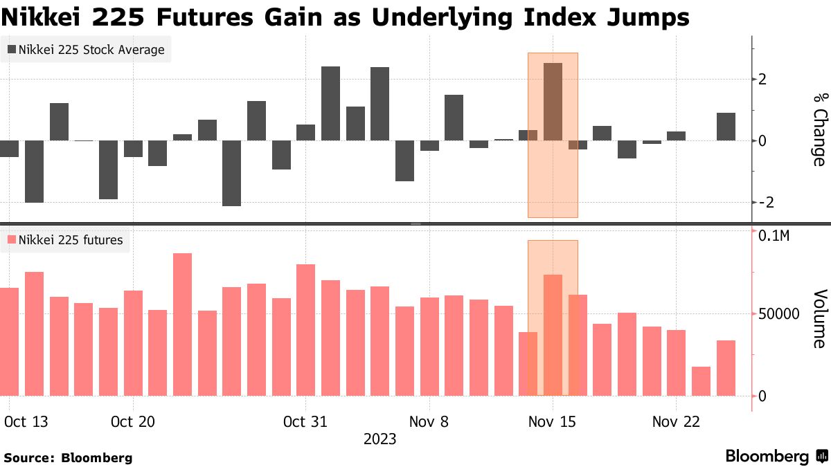 长期国库券收益率从5%回落后,股市最近的涨势在很大程度上是由期货交易员平仓空头头寸推动的,东京证券研究所的策略师永田清秀表示。全球股市因债券收益率上升引发的紧张情绪一直承受着压力。