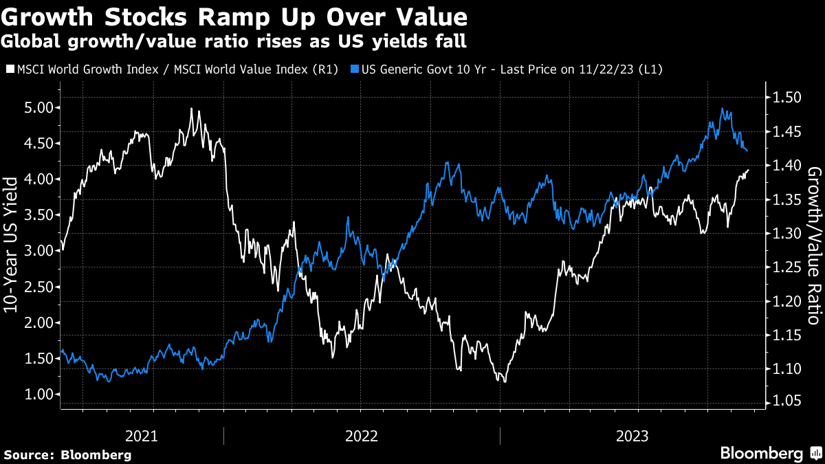 全球成长股在本月表现出色,超过了更与经济走势密切相关的价值较低的股票,因为通货膨胀放缓,投资者押注美联储已经停止加息。MSCI全球成长指数与MSCI全球价值指数的比率已经上升至2022年初以来的最高水平,最新的上涨与10年期国债收益率的下降同时发生。