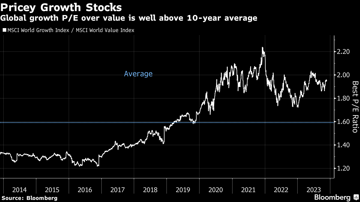 MSCI全球成长指数的12个月前瞻市盈率超过24,而10年平均值约为21.7。它相对于全球价值的溢价也远高于历史平均水平。