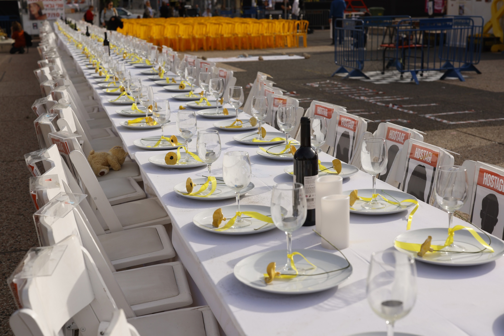周三,在特拉维夫艺术博物馆外,展示了一张餐桌,上面摆放着240张空椅子,代表以色列人质。