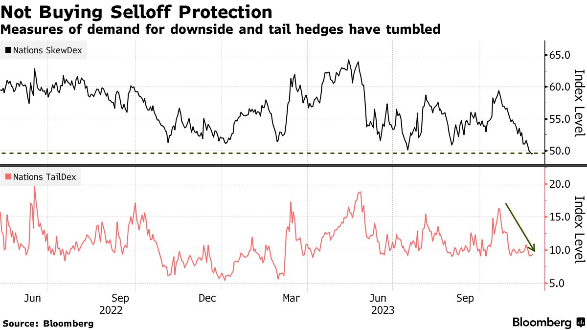 “对冲需求绝对没有,使用各种指标进行保护的成本都接近五年来的低点,”RBC Capital Markets衍生品策略负责人Amy Wu Silverman表示。“此外,由于波动性卖出策略,我们市场的波动性继续被抑制。”