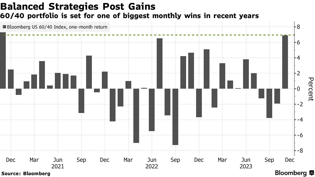 推动这一切的是对美联储已经停止加息并将在2024年开始降息的信念——这种推测使得股债比例为60/40的投资组合迎来了自2020年以来的最佳月份。