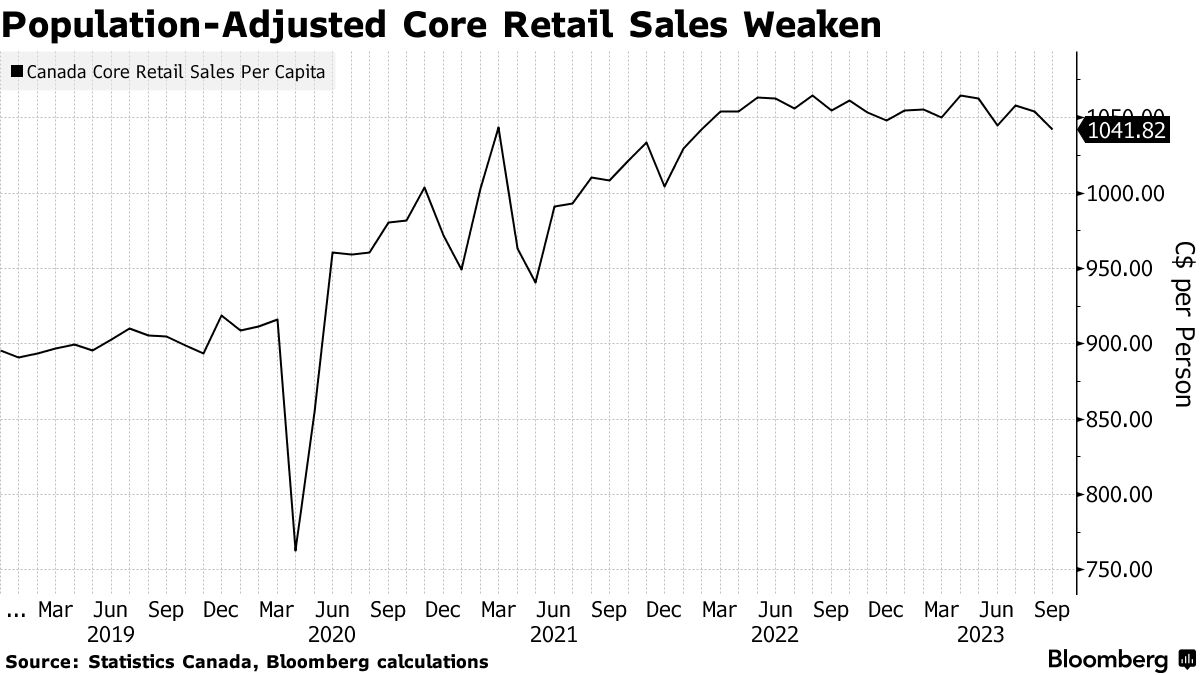 考虑到最新的零售数据,预测显示第三季度实际国内生产总值增长微乎其微,第四季度只会略微增长,德加尔丹证券的宏观策略师蒂亚戈·菲格雷多在一份提交给投资者的报告中表示。“考虑到人口增长激增,这些几乎不令人振奋的国内生产总值预测。因此,我们继续认为加拿大央行已经停止加息,经济可能在2024年初陷入衰退。”