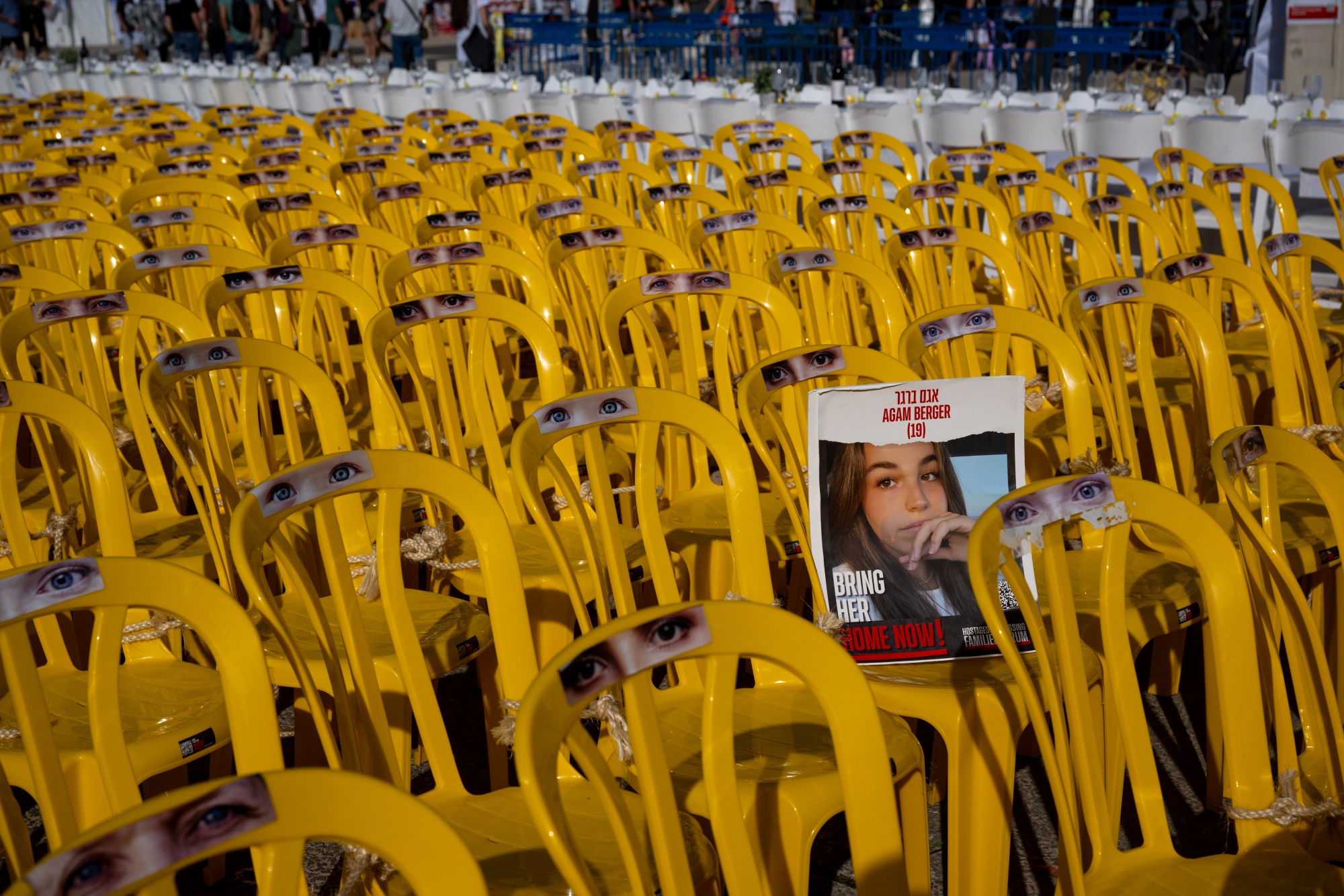 在政府会议地点对面设立了一个“人质广场”。在特拉维夫艺术博物馆外,摆放了240个空位,准备进行安息日晚餐。