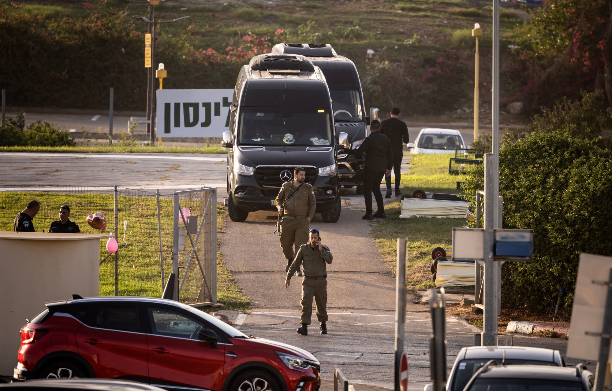 以色列安全部队在特拉维夫施耐德医疗中心的直升机停机坪等待,为释放以色列人质做准备。摄影师:法德尔·塞纳/法新社/盖蒂图片社### “人质广场”