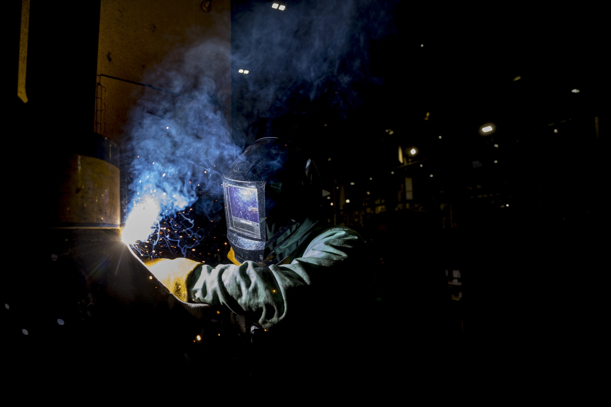 一名焊工在乔治亚州韦克罗斯的一辆火车头上工作。