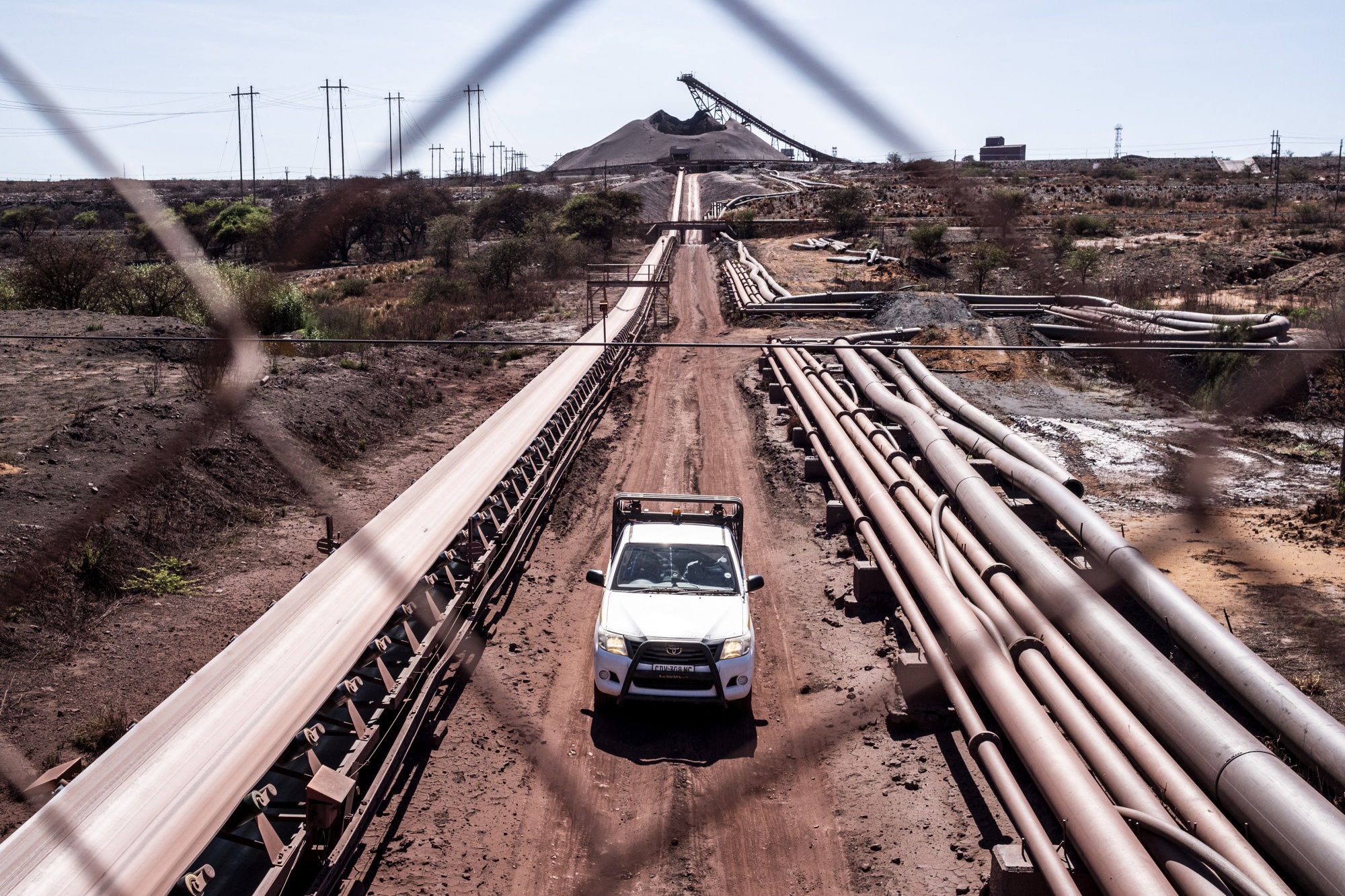 一辆车在南非卡图附近的英美西申铁矿开采场行驶。