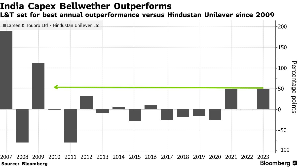 今年以来,拉森公司的股价已经比印度联合利华的股价高出近50个百分点,这是自2009年以来表现最好的一次。同样,印度最大的电缆和电线制造商Polycab India Ltd.的股价今年已经上涨了106%,而Havells India Ltd.——销售吊扇、热水器和其他家用电器的公司——的股价仅上涨了18%。