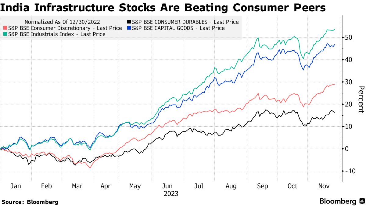 工业股正处于甜蜜时期,因为印度的经济转型在明年联邦选举之前进入高速发展阶段,全球公司将该国作为“中国+1”战略的一部分。苹果公司正在扩大在印度的生产,而特斯拉公司则正在接近一项协议,允许其在两年内在该国建厂。