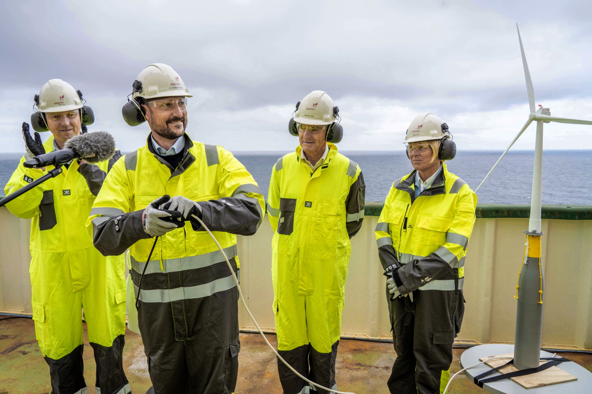挪威王储哈康王子(居中左)和挪威总理约纳斯·加尔·斯托尔(居中右)参加海风塔彭海上风电场的启用仪式。摄影师:Ole Berg-Rusten/AFP海风塔彭海上风电场的每台风力涡轮机重量相当于自由女神像,并通过强大的吸力锚固连结到海床上。对于建造它们的挪威国有石油和天然气巨头Equinor来说,它们是利用电力来大幅减少产品碳足迹的重要计划的一部分。