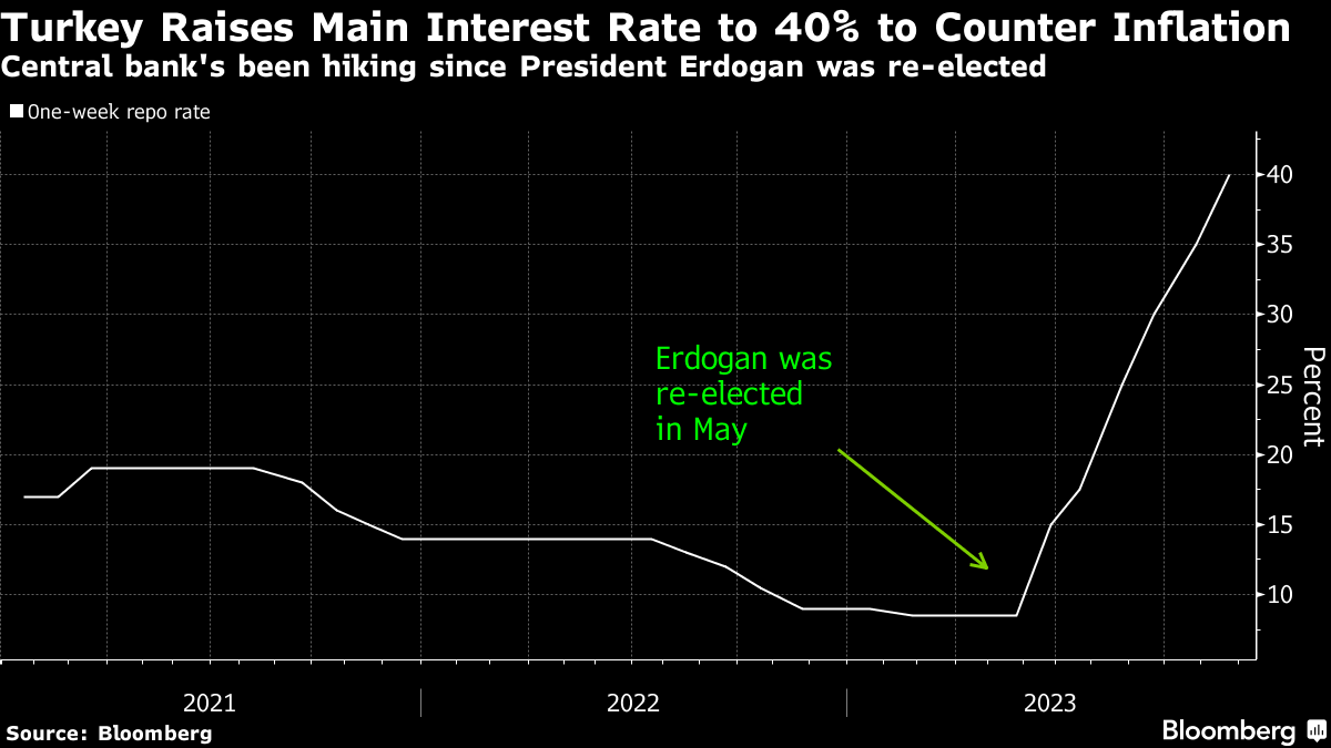 埃隆·马斯克,中间,和本杰明·内塔尼亚胡,右边,于11月27日在卡法尔阿扎。来源:以色列总理**超出预期的加息:**土耳其央行将一周基准回购利率上调 500个基点至40%,但暗示未来将放缓紧缩步伐。