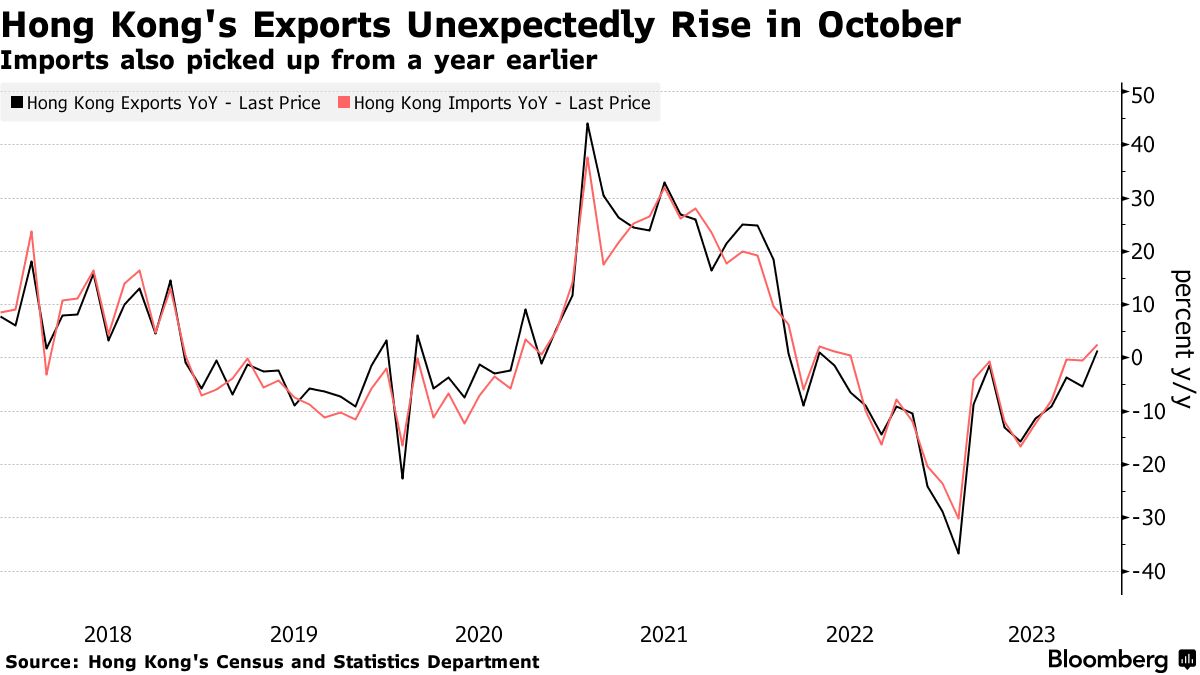 10月份海外出货同比增长1.4%,达到3799亿港元(488亿美元),香港政府统计处周一表示。这比经济学家在彭博调查中预测的下降2.9%的中位数估计要好,也标志着自2022年4月以来出口首次出现增长。