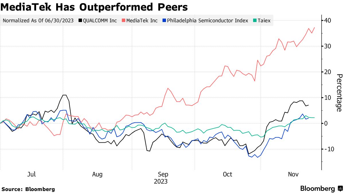 自6月底以来,这家台湾科技公司的股价已飙升近40%,远超费城半导体指数的2%涨幅和美国竞争对手高通公司的7%涨幅。这一涨势得益于对利用该公司芯片的移动设备的强劲需求,尤其是在中国市场。