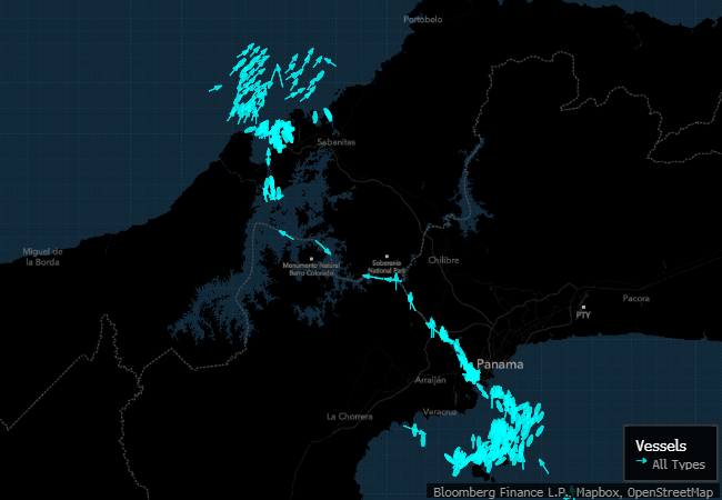 船只等待穿越巴拿马运河。这使得船只只有少数几个选择:长时间等待通行,改道,绕过南美洲航行数千英里,或者支付高价以获得更快的通行船位。
