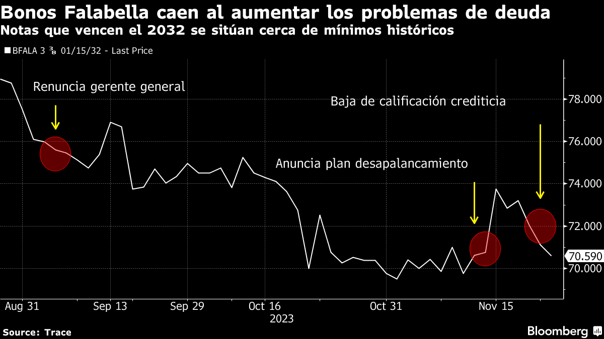 上周,在这家智利零售巨头披露计划减少债务负担几天后,惠誉评级和标普全球评级将其信用评级下调至投机级别或“垃圾”级别。其到2032年到期的美元债券在一周内下跌了2.53美分,跌至每美元70.59美分。