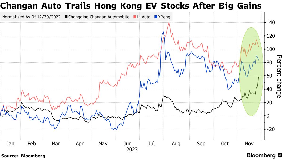 长安汽车已经与华为合作推出了阿瓦特品牌的豪华电动汽车,是今年沪深300指数中表现最好的股票之一,上涨了59%。这家国有传统汽车制造商仍然落后于香港上市的纯电动汽车公司,比如理想汽车,后者在2023年迄今已经翻了一番多。
