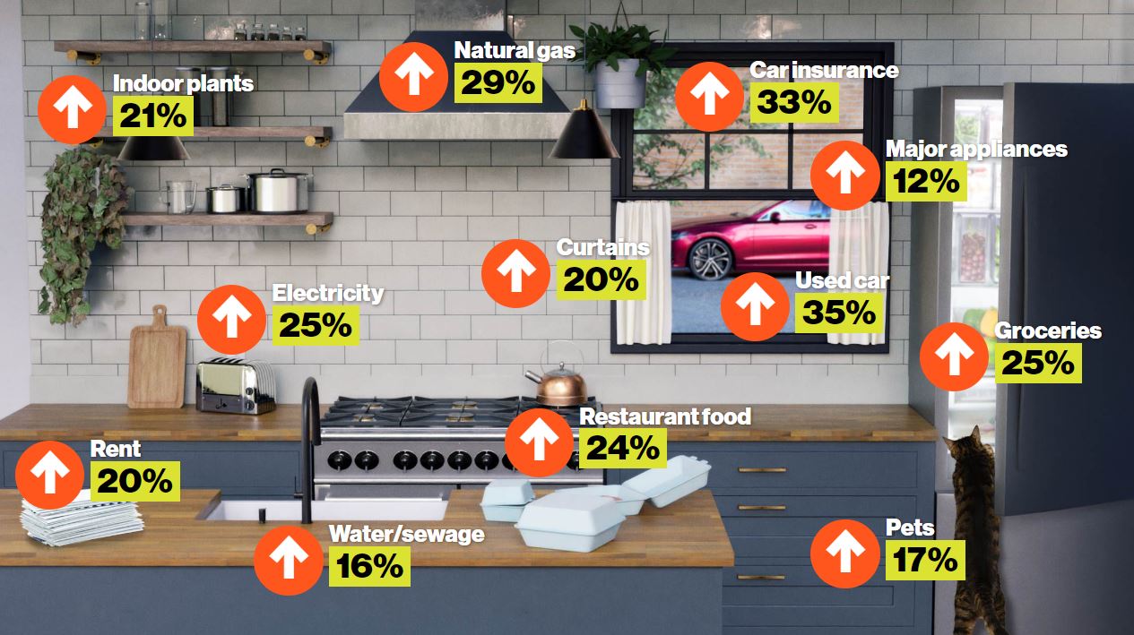 坦率地说,很难找到一个家庭预算没有受到影响的部分。食品杂货上涨了25%,公用事业费用也上涨了相当多。租金大约高出20%。二手车及其保险成本也上涨了。通货膨胀也影响了室内植物和宠物用品。