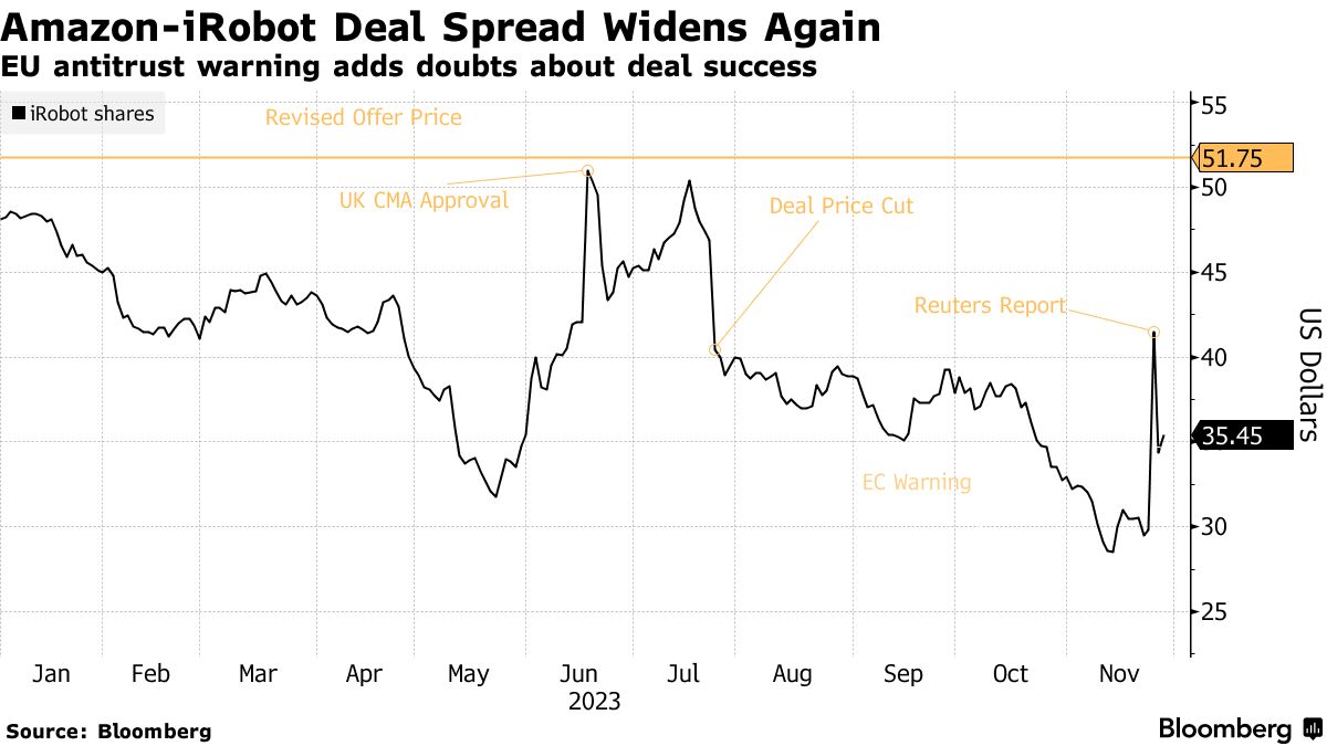 这家负债累累的Roomba制造商在经历了疫情期间的繁荣后,今年收入停滞不前。自7月以来,股价一直在下降,当时iRobot同意在获得新融资后降低了报价。在路透社的报道暗示审查更容易之后,交易差价——即机器人吸尘器制造商的股价和亚马逊的报价之间的差距——在周五缩小到约10美元,但在欧盟委员会的警告后,这一差距已经扩大到16美元以上。