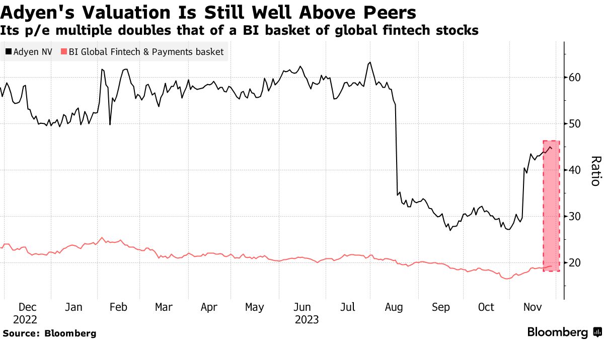 即使在今年的下跌之后,Adyen看起来比同行公司昂贵。这家荷兰公司的前瞻性收益为44倍,而PayPal为10倍,彭博智库的全球金融科技股票篮子为19倍。其股价比平均分析师目标高出6%。