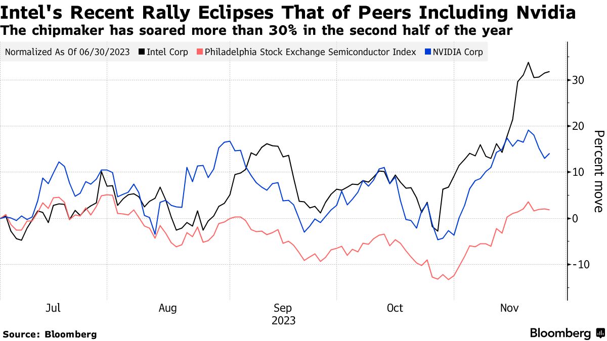 英特尔公司在下半年上涨了近32%,得益于个人电脑市场的改善和更具竞争力的产品线。上个月,这家芯片制造商预测第四季度销售将实现增长。这些收益帮助该股票在费城半导体指数中表现优异,包括在同一时期的英伟达公司。英特尔周二下跌了0.8%。