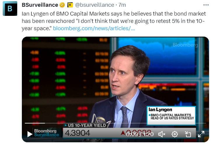 “我认为我们不会在10年期债券领域重新测试5%的水平,”林根今天在Surveillance上说道,此时该基准债券的收益率仅略低于4.4%。“我肯定会在现在和明年年底之间继续持有美国国债,但要注意这将是一段波动的旅程。”