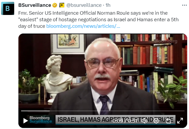 由于停火将持续至周四,共计六天,美国国务卿安东尼·布林肯将返回该地区,鲁勒说,以色列目前正忙于遣返哈马斯扣押的囚犯和收集情报。他说,摧毁哈马斯仍然是议程上的事项。
