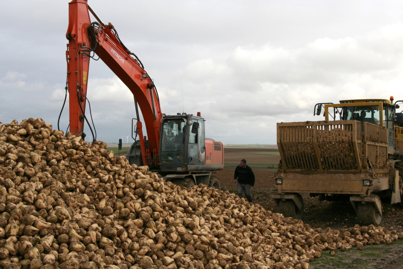 一台起重机在法国北部的田野上装载甜菜,准备运往附近的加工厂。